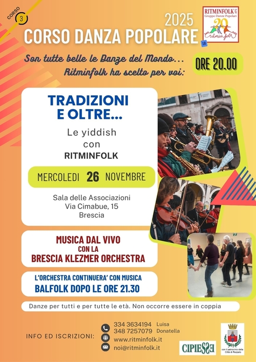 Alcuni partecipanti di Ritminfolk insieme alla Brescia Klezmer Orchestra, mercoledì 26 novembre, vi invitano a ripassare con loro alcune delle danze oggetto di studio (Hora Bucovineasca - Freylakhs - Bulgar – Sher – Patch tants); a seguire poi, sempre con musica dal vivo, balfolk con musiche varie, non solo Yiddish.